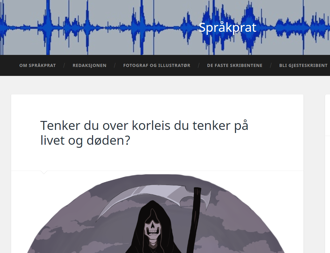 Om du ønskjer å lese meir om metaforar, kan du lese dei tidlegare Språkprat-innlegga «Elefantar og kamelar til bry – ein studie av metaforbruk» (06.07.18) av Helga Mannsåker og «Tenker du over korleis du tenker på døden?» (06.04.18) av Maren Østrem Nesse. Skjermdumpen ovanfor viser starten på sistnemnde innlegg, med ein illustrasjon av Ida Torkildsen. Kjelde: www.språkprat.no.