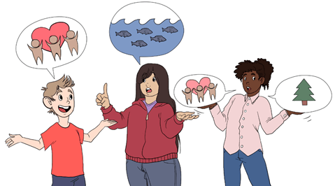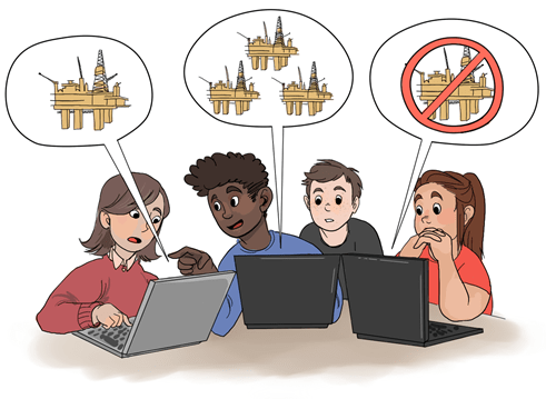 Illustrasjonen viser korleis eleven Tom argumenterer for full oljeboring i Lofoten, som var scenario A i klasseromsdebatten. Illustrasjon: Ida Torkildsen.