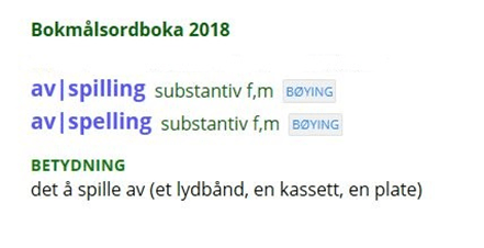 Eit anna døme på ordboktekst som ikkje lenger passar like godt med moderne språkbruk, er ordet avspilling. Før revisjonen såg artikkelen slik ut i Bokmålsordboka: