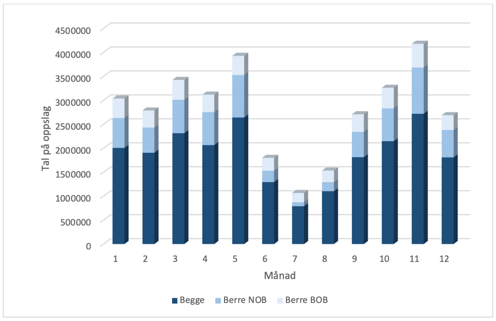 Figuren ovanfor viser bruken av nettordbøkene i 2019. Det er ei søyle for kvar månad, og me ser at bruken varierer ein del gjennom året. Mellom anna er det lett å sjå kva tid det er sommarferie, og kva tid det er mange som har eksamenar. Det blir gjort litt fleire søk i Nynorskordboka enn i Bokmålsordboka, men i denne samanhengen er det særleg interessant at om lag 70 prosent bruker standardsøket med å slå opp i begge ordbøkene parallelt. Då får ein dei to artiklane opp ved sida av kvarandre på skjermen, og det blir meir merkbart enn før at det er ein del skilnader mellom ordbøkene.