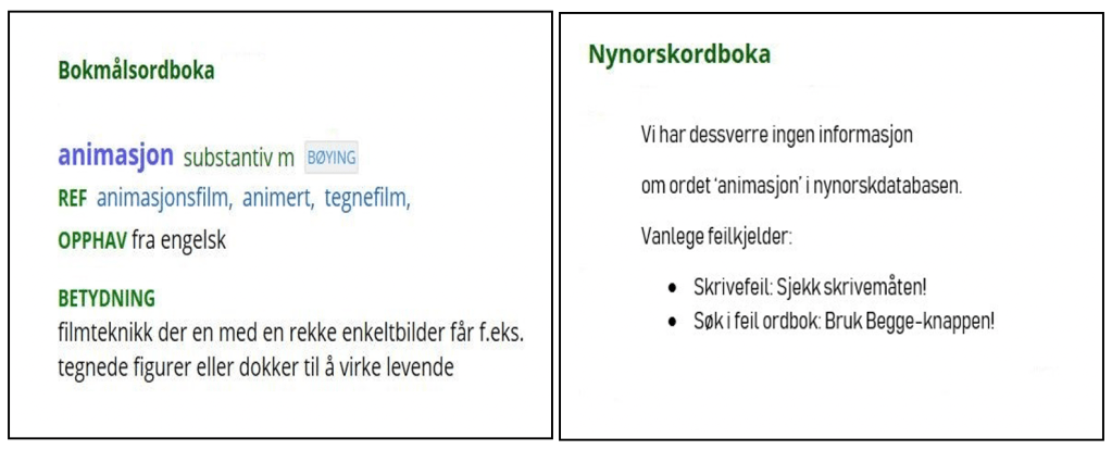 Viss ein til dømes slår opp på animasjon, finn ein at dette ordet er med i Bokmålsordboka, men ikkje i Nynorskordboka (sjå figuren). Mange tolkar ulikskapane mellom ordbøkene som ulikskapar mellom nynorsk og bokmål, og dei konkluderer dermed med at dette ordet er «forbode» å bruka på nynorsk. Men det er slett ikkje alle skilnader mellom ordbøkene som har rot i målformskilnader. Ofte er dei berre tilfeldige, slik dei er i dette tilfellet, og då er det uheldig at dei blir oppfatta som noko anna av brukarane. Difor er det ei viktig oppgåve i revisjonen å redusera slike umotiverte skilnader.
