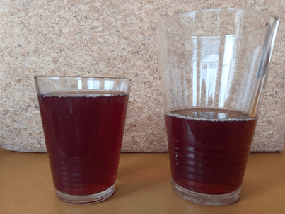 Iallfall ved første øyekast er det lett å tru at det er mest saft i glasset til venstre. Men i realiteten har jeg helt akkurat like mye i begge glassa, nemlig to desiliter. Når vi oppfatter det som om glasset til venstre inneholder mest saft, er det fordi safta når høgere i glasset der ‒ og vi har livslang erfaring med at det betyr mer innhold. Mer er opp.