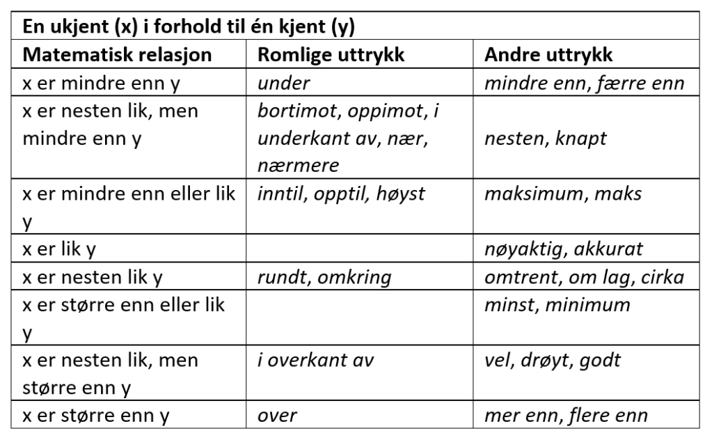 Vi snakker om tall daglig, ved hjelp av tallord og forskjellige andre uttrykk. Svært ofte er det slik at vi ikke husker, kjenner eller kan fastslå de nøyaktige talla. Da trenger vi å uttrykke oss omtrentlig, og språket har mange hjelpemiddel til nettopp det. Vi har ganske så finmaska språklige inndelinger som uttrykker ulike matematiske relasjoner. Vi kan for eksempel si «Boka koster bortimot tusen kroner». Kroneantallet er her en ukjent x, og x er nesten lik, men mindre enn 1000. Preposisjonen bortimot uttrykker altså det komplekse matematiske forholdet ‘nesten lik, men mindre enn’.