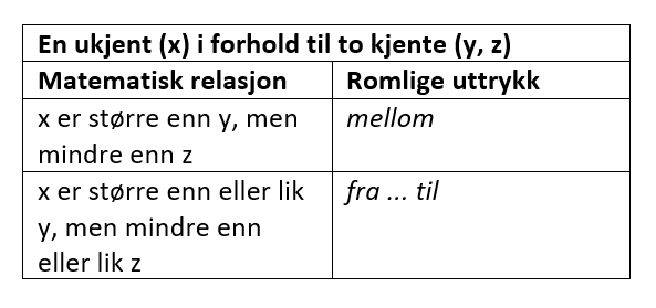 De matematiske relasjonene og uttrykka i tabellen ovafor gjør bruk av bare én kjent. Men vi har òg uttrykksmåter for å plassere den ukjente i høve til to kjente tall. Det gjør vi for eksempel med mellom dersom vi sier «Boka koster mellom 900 og 1000 kroner». Her er den ukjente større enn 900, men mindre enn 1000. I den neste tabellen er det vist matematiske relasjoner som gjør bruk av to kjente, og allmennspråklige uttrykk for dem.