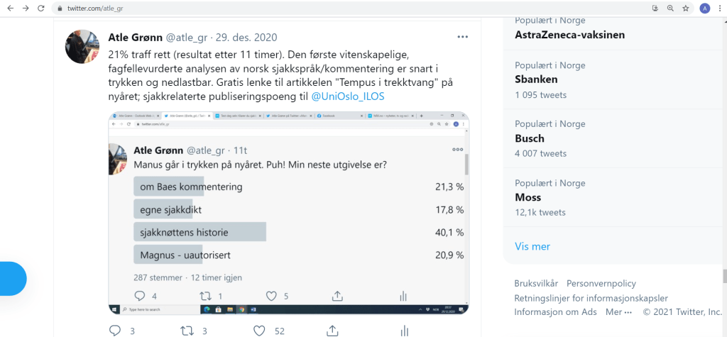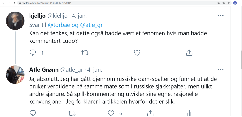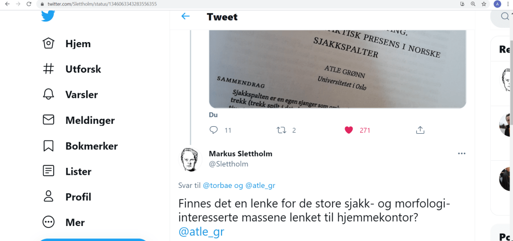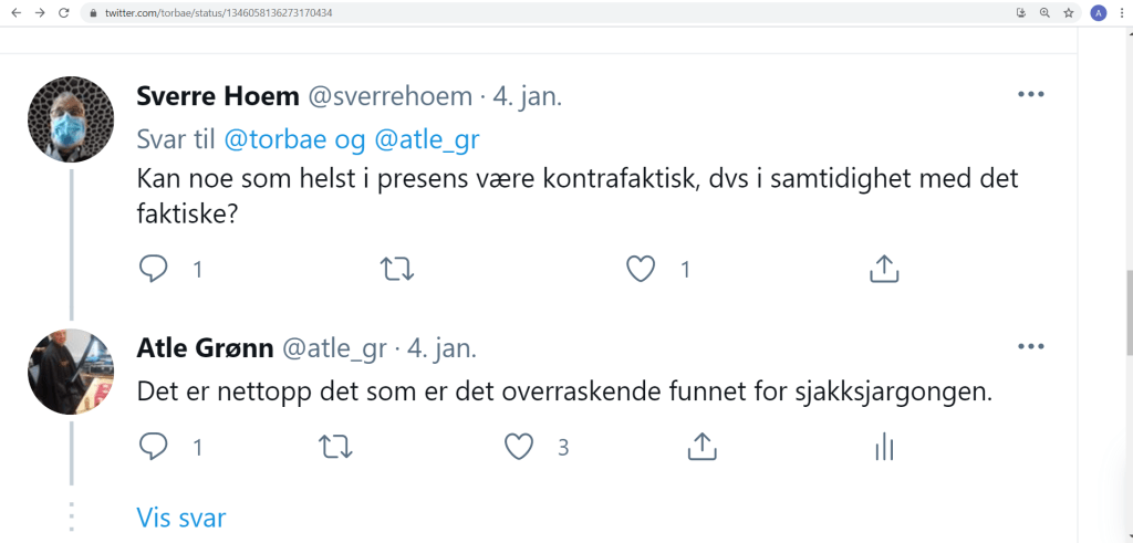 Artikkelen min fra 2020 om kontrafaktisk presens i norsk sjakkspråk kan lastes ned her: «Tempus i trekktvang. Om en kontrafaktisk presens i norske sjakkspalter». Her forklarer jeg de spesielle konvensjonene og konkurransen mellom verbformer i sjakkspaltene. Jeg har gjennomgått hundrevis av sjakkspalter i Aftenposten, Dagbladet og VG og kartlagt den spesielle presensbruken.
