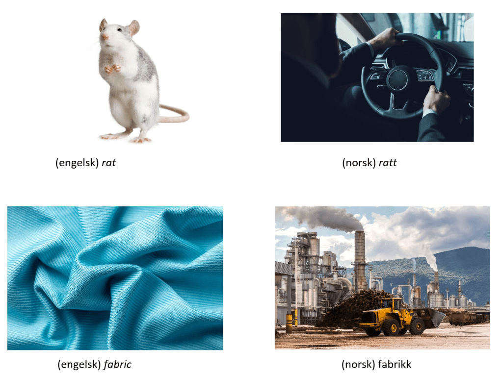 Selv om enkelte engelske ord virker godt innarbeidet i det norske språket, er den allmenne kjennskapen til ordenes form eller egentlige betydning enten overfladisk eller bare tilsynelatende god. Den unøyaktige kunnskapen kan dermed føre til komiske språklige situasjoner. Hva hvis en nordmann sier teit på engelsk når han mener dum, og tror at det engelske ordet tight betyr akkurat det samme fordi det uttales nesten likt? Eller hva hvis man bruker det engelske ordet rat for å betegne det norske ordet ratt? Sånne morsomme overføringer fra ett språk til et annet skjer nettopp fordi ordene likner på hverandre i sin form eller uttale, og flere kan automatisk anta at de betyr det samme. Men denne slektskapen er altså «falsk».