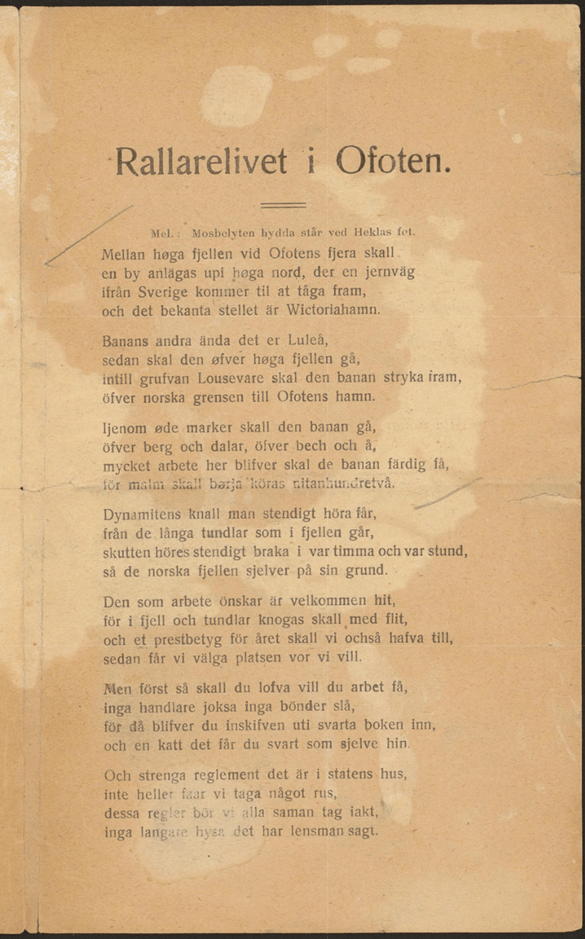 «Mellan høga fjellen vid Ofotens fjord, skall en by anlägas upi høga nord.» Slik begynner rallarvisa som i dag oftest kalles for Rombaksvisa. Som en kan se, varierer teksten mellom svensk og norsk. Her fins både typisk norske ord som by, typisk svenske stavinger av ord som mellan og vid, og mer eller mindre blandede stavemåter som fjellen med norsk e og høga med norsk ø og ellers svensk staving (svensk: höga og fjällen, norsk: høie og Fjeldene). Hva slags tekster er rallarviser? Og hvorfor er denne rallarvisa så språkblanda? Dette skal vi se nærmere på i denne språkpraten.