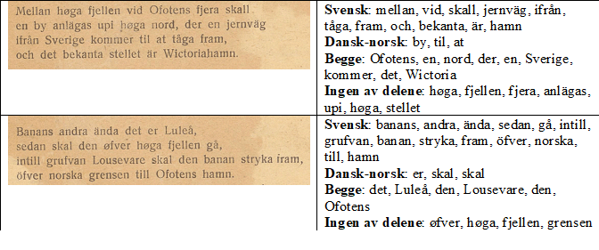 Som vi allerede har sett, framstår språket i skillingstrykket fra Narvik (1901) som ei blanding mellom norsk og svensk. Vi skal nå se litt nærmere på hvordan skillingstrykket varierer mellom de to standardskriftspråkene som var i bruk på den tida: svensk og dansk-norsk. Siden svensk og norsk er såpass like språk med mye språklig til felles, kan det være lurt å ta utgangspunkt i noe som er helt klart forskjellig, for eksempel bøyingsmønstrene.