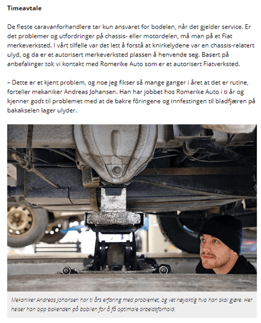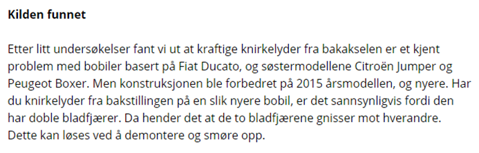 Artikkelen handler om redaktøren som opplevde knirkelyder i bobilen. Han tar med bobilen på verksted, og vi får innblikk i hva mekanikerne gjør for å løse problemet. Artikkelen er teknisk og informativ, og vil derfor være mest relevant for de som opplever knirkelyder selv, eller for spesielt interesserte. Formålet er å overbevise leseren om at Din Fritid kan dette, og sjangeren er altså utpreget retorisk. Ulike stemmer i teksten klinger sammen for å underbygge dette budskapet.