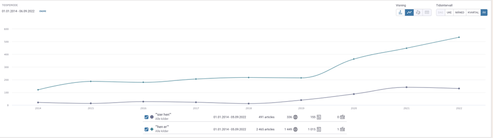 Vi kan ikke trekke noen endelige konklusjoner om nordmenns holdninger til og bruk av hen ifremtiden. Men basert på data fra andre land kan vi prøve å tenke oss til et par mulige scenarier. En studie av holdninger til og bruk av hen i Sverige viste at folks holdninger til ordet ble mer positive med tiden.[i] Bruken av ordet i svenske medier har dessuten økt jevnt med tiden (frem til 2020, hvor bruken stagnerte. Hvis det blir ‘svenske tilstander’ i Norge, kan vi altså anta at negative holdninger vil nøytraliseres litt med tiden, kanskje i forbindelse med at ordet innarbeides i språket og oppleves mindre ‘fremmed’ eller ‘uvant’ for folk – eller fordi holdninger til kjønnsmangfold stadig blir mer positive. Dessuten kan vi kanskje anta at fordi hen har blitt innført i norske ordbøker av et formelt språkorgan som har stor autoritet i Norge, kan dette både føre til økt bruk og endrede holdninger. Hvis vi skal si noe om hvem som kommer til å stå for bruken av hen eller andre kjønnsnøytrale pronomen, er det den yngre generasjonen som utpeker seg. Det stemmer både overens med mine egne funn, og med funnene i Bufdirs ferske rapport som viser at yngre nordmenn har langt mer positive holdninger til kjønnsmangfold enn de eldre.