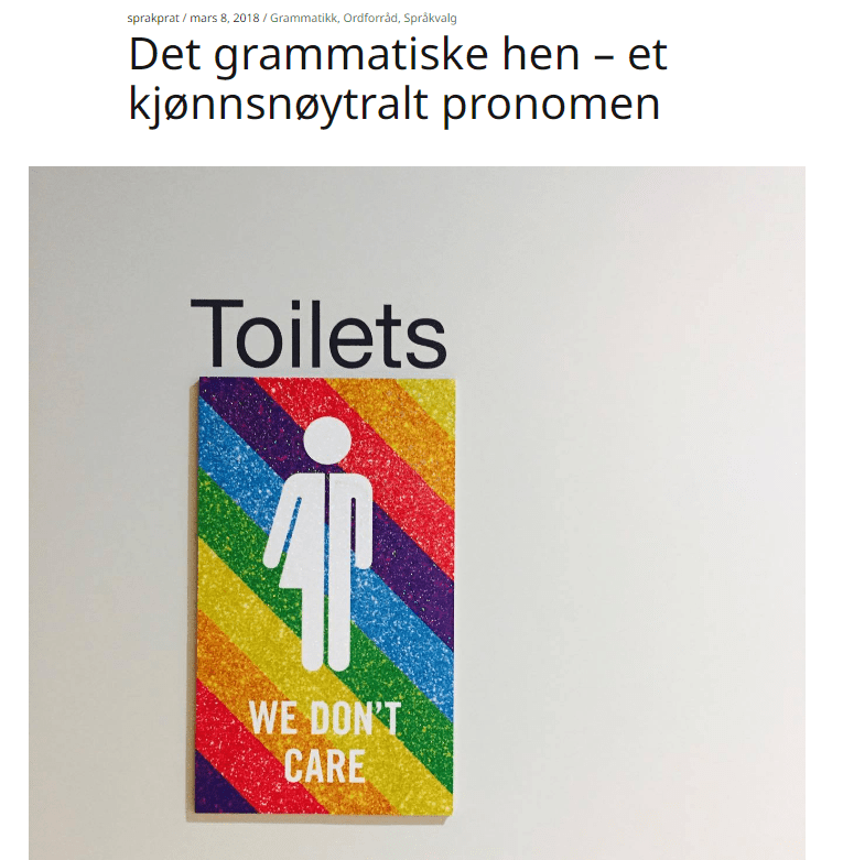 Lurer du på forskjeller og likheter mellom norsk, svensk og engelsk når det kommer til kjønnsnøytrale pronomen? Dette har jeg skrevet mer om i en tidligere Språkprat-tekst: «Hen, men også they, zie, xe og ey – kjønnsnøytrale pronomen i norsk, svensk og engelsk» (03.01.19).