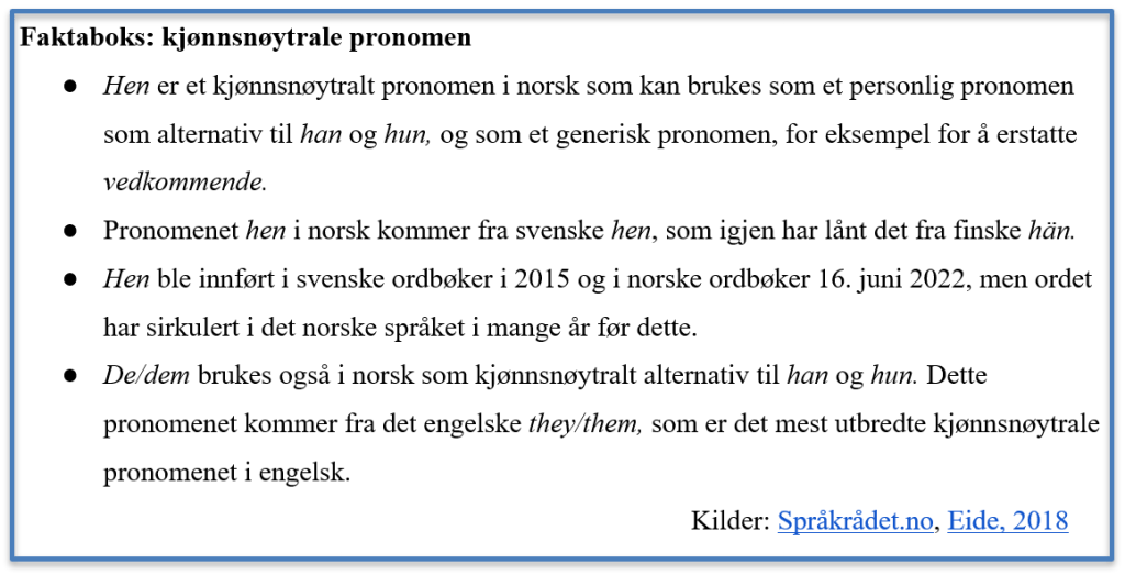 [i] Se blant annet Han, hun, men ikke hen – hvorfor det, egentlig? i REPLIKK – Tidsskrift for samfunnsvitskap og humaniora 2020 (48) s. 20–27.