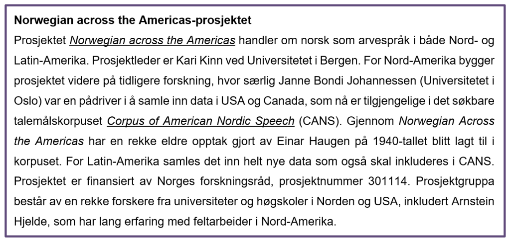 For Sverre er norsk et arvespråk. Et arvespråk er et språk man lærer som barn, i familien, men som er lite brukt ellers i storsamfunnet der man bor. Norsk som arvespråk i USA er velkjent, men norsk i Latin-Amerika er derimot ukjent for de fleste. Selv om det finnes undersøkelser av både svensk og dansk i Argentina, har ingen studert språket hos etterkommerne av norske Latin-Amerika-farere systematisk før vi startet forskningsprosjektet Norwegian across the Americas i 2020, finansiert av Norges Forskningsråd (se faktarute). Observasjonene i denne artikkelen er hentet fra dette prosjektet.