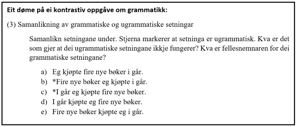 Komparativt (samanliknande) arbeid med språk er også utforskande ved at ein skal peike på og diskutere likskapar og ulikskapar mellom språk. Studentane våre fekk to komparative oppgåver. I den eine oppgåva skulle dei setje ein enkel engelsk tekst om til norsk og samanlikne den språklege oppbygginga til dei to språka. Sjølv med ein kort tekst kunne vi tematisere fleire grammatiske fenomen, til dømes plassering av verbalet, plassering av eigedomspronomen og adjektivbøying.