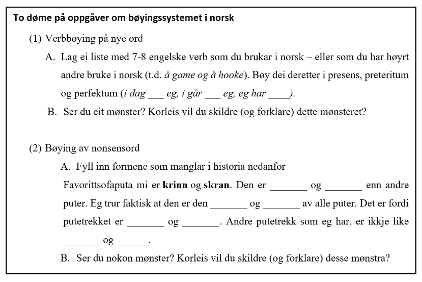 I språksamtalane brukte vi mellom anna to oppgåver der studentane skulle undersøke bøyingssystemet i norsk, som dokker kan sjå nedanfor: