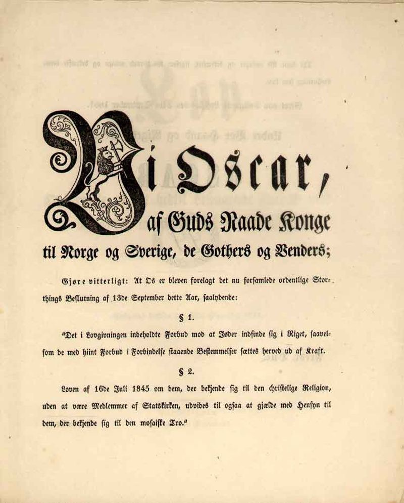 Ei endring av Grunnlova i 1851 sette punktum for ei lang historie med særbehandling av jødar og andre som ikkje følgde «den evangelisk-lutherske Religion». Tidlegare hadde desse gruppene berre unntaksvis fått opphalde seg i riket, men no vart restriksjonane fjerna.