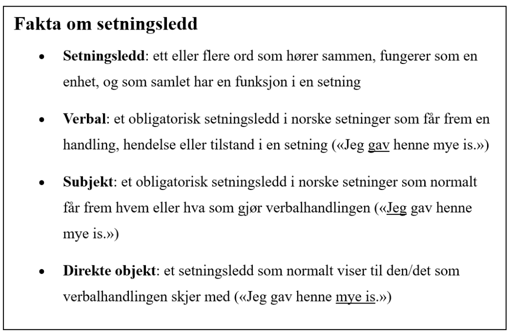 Vil du lese mer om setningsledd og øve på det, kan jeg ellers anbefale «Norsksidene» til Globalskolen, som jeg selv var med på å kvalitetssikre på et tidligere tidspunkt. Disse sidene blir nå ikke lenger oppdatert, men kunnskapen er i praksis fortsatt aktuell.