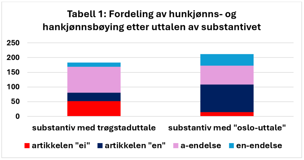 Tabellen under viser fordelinga av ubestemt artikkel og hunkjønns- og hankjønnsbøying av alle substantiva i studien etter om det var brukt Trøgstad-uttale eller Oslo-uttale på ordet: