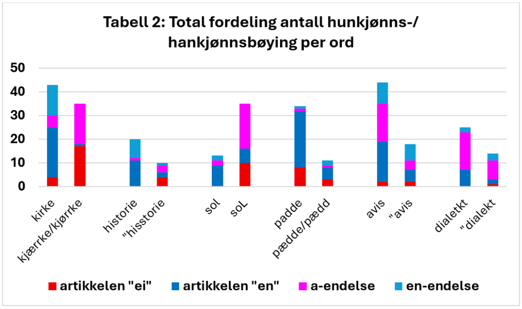 Tabell 2 viser den totale fordelingen av hankjønns- og hunkjønnsbøying for et utvalg av ord fra studien: