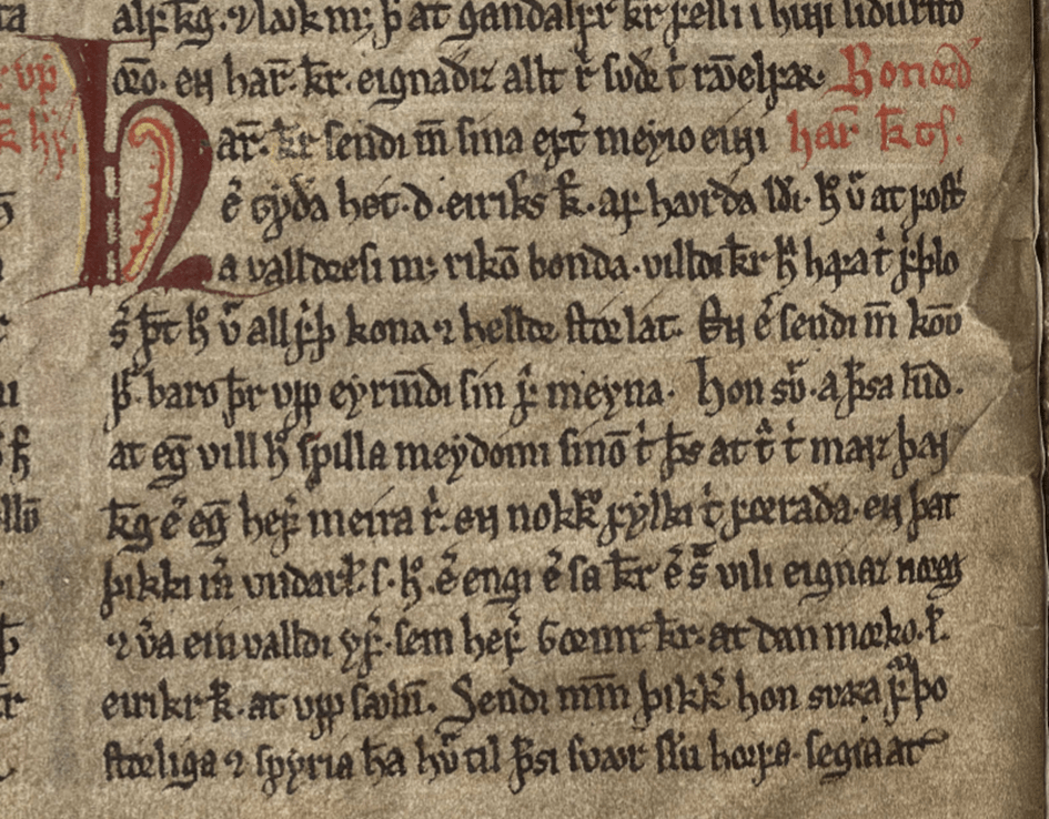La oss se på et utklipp fra en side i en faksimileutgave av et håndskrift som blant annet inneholder Harald hårfagres saga. Samme teksten har jeg i et annet perspektiv omtalt i språkpraten «Likt og ulikt i norrønt og i moderne norsk» (2025, 21. mars).