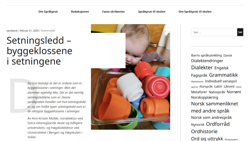 Språkprat publiserer for tiden flere språkprater om grunnleggende kunnskap om ordforråd og grammatikk, med eksempler fra norsk og andre språk. Disse er utviklet for å inngå i nettressursen «Språkprat til skolen», som har undervisningsopplegg for språktemaene i norskfaget på videregående skole. Også følgende to nyere språkprater dekker grunnleggende kunnskap om ordforråd og grammatikk: «Ledd, setningar og kommareglar» (2024, 27. september) av Ragnhild Lie Anderson og «Hva har biler og forvirring til felles? Om ordklasser og inndeling av ord» (2025, 24. januar) av Klara Sjo.
