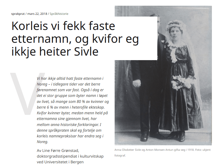 Eg har skrive om innføring av etternamn i Noreg i slektstidsskriftet Genealogen nr. 2, 2001 (Utviklinga av slektsnavn i Norge, med særlig vekt på sen-navn), og om etternamn for kvinner i nr. 2, 2002 (Gifte kvinners etternavn, slektsnavn og mellomnavn). Begge artiklane har lange historiske linjer med mange detaljar. Korte framstillingar finn du i eit par kapittel i boka mi Hva er et navn? (2011).