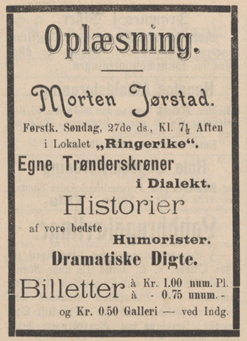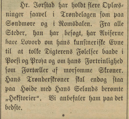 Blant de aller mest aktive var Morten Jørstad (1875–1932), skribent og foredragsholder fra Inderøy i Trondheimsfjorden, som i ung alder begynte å reise rundt som «Oplæser». Først i lokalmiljøet nord i Trøndelag, og så fra 1898 på Møre, i Nord-Norge og på Vestlandet. Ei rekke annonser i ulike lokalaviser viser at han var på lange turneer i åra omkring 1900. Sjøl om han også hadde seriøs litteratur på programmet, som tekster av Bjørnson, Garborg og Sivle, gjorde han etter anmeldelsene å dømme mest lykke med sine «udmerket morsomme Trønderskrøner», som en journalist formulerer det i 1899. Det ser rett og slett ut til at det er i forbindelse med Jørstads virksomhet at begrepet «trønderskrøne» blir en del av avisspråket. Da reisevirksomheten hans avtok omkring 1906, hadde tilhørere fra Hammerfest i nord til Arendal i sør hørt trønderens framføringer. Det er vanskelig å beregne hvor stort det samla publikummet hans var, men i ei tid der radio fortsatt var et ukjent fenomen, må vi kunne si at han nådde ut til en imponerende tilhørerskare.