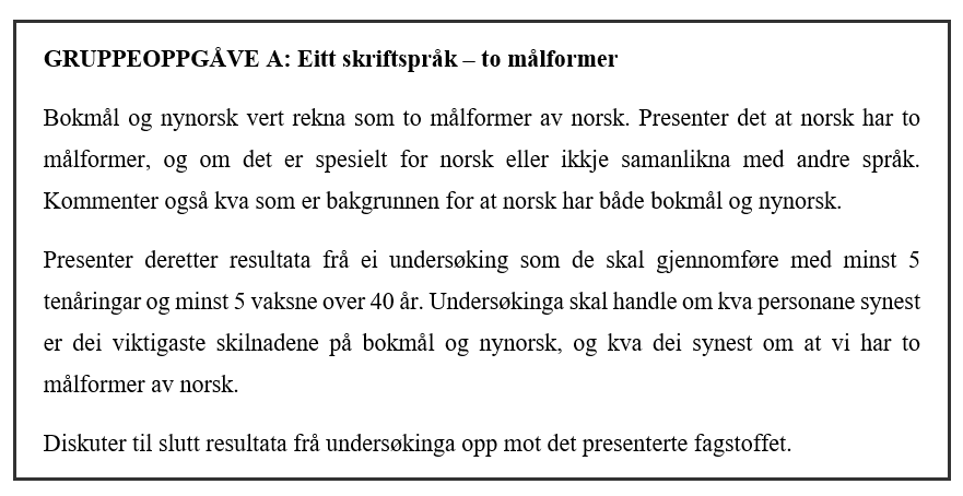 Alle gruppene fikk en oppgaveformulering for temaet sitt der det stod hva de skulle svare på. Her er et eksempel i form av oppgaveformuleringen til den første oppgaven, som var utformet på omtrent samme måte som de andre oppgavene: