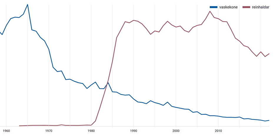 Nasjonalbibliotekets N-gram, som du finn her, kan vise kor mykje eitt eller fleire ord blir brukte over tid. Dataa er henta frå Nasjonalbiblioteket sine aviser og bøker.