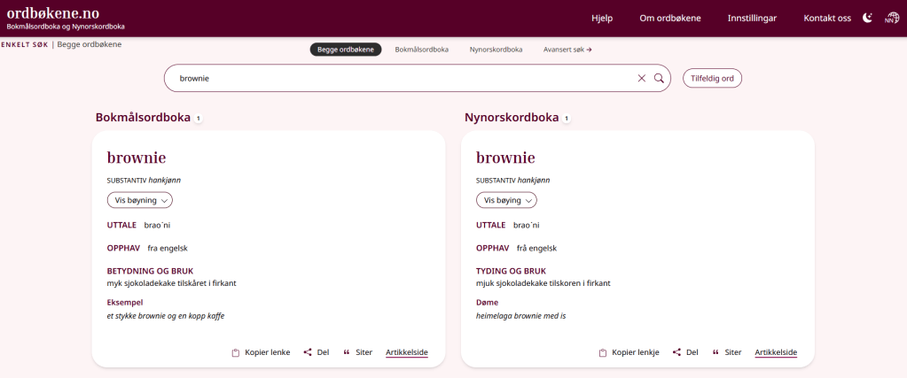 Brownie har etter kvart blitt oppfatta som noko heilt vanleg som vi snakkar om på norsk, og dermed passa ordet til å bli teke inn i Bokmålsordboka og Nynorskordboka.