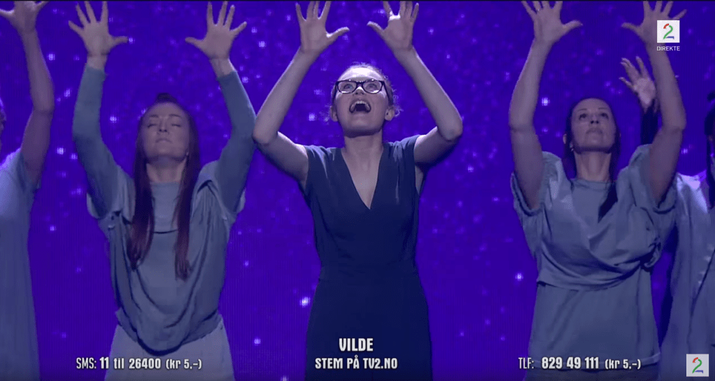 Sjå denne videoen av ei av framføringane til Vilde Winge i Norske talenter 2017, der talentet hennar var å bruke teiknspråk på songar. Videoen viser songen «La meg leve»: